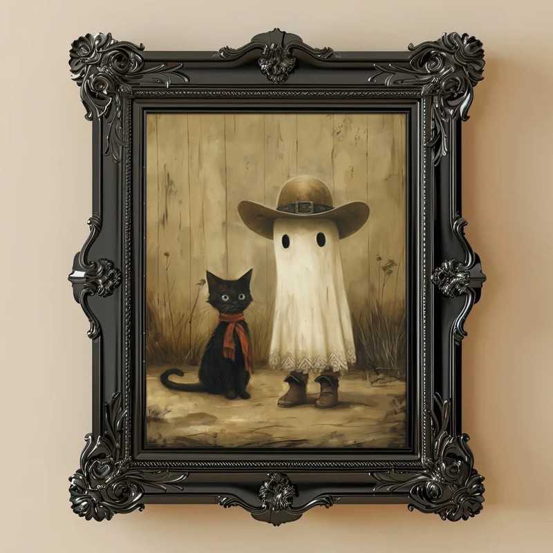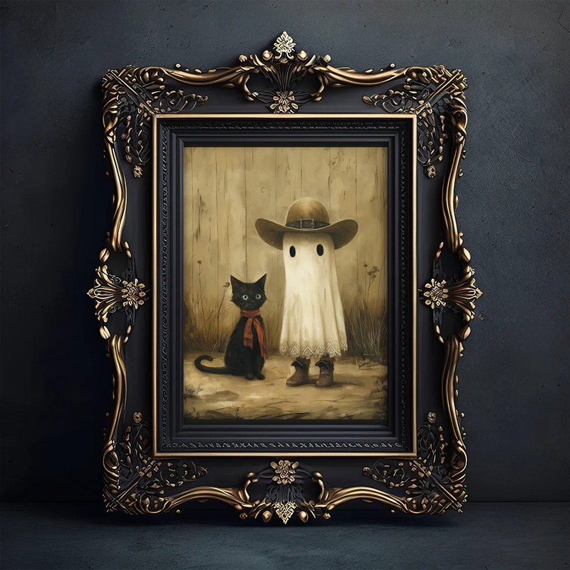 Halloween Cowboy Ghost and Black Cat Vintage Style Art Frame Halloween Decor