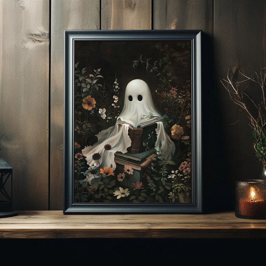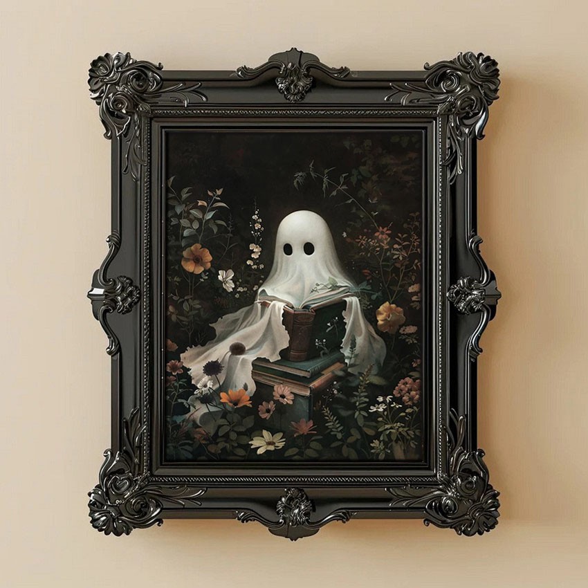 Halloween Cute Ghost Reading Books Art Frame Halloween Decor