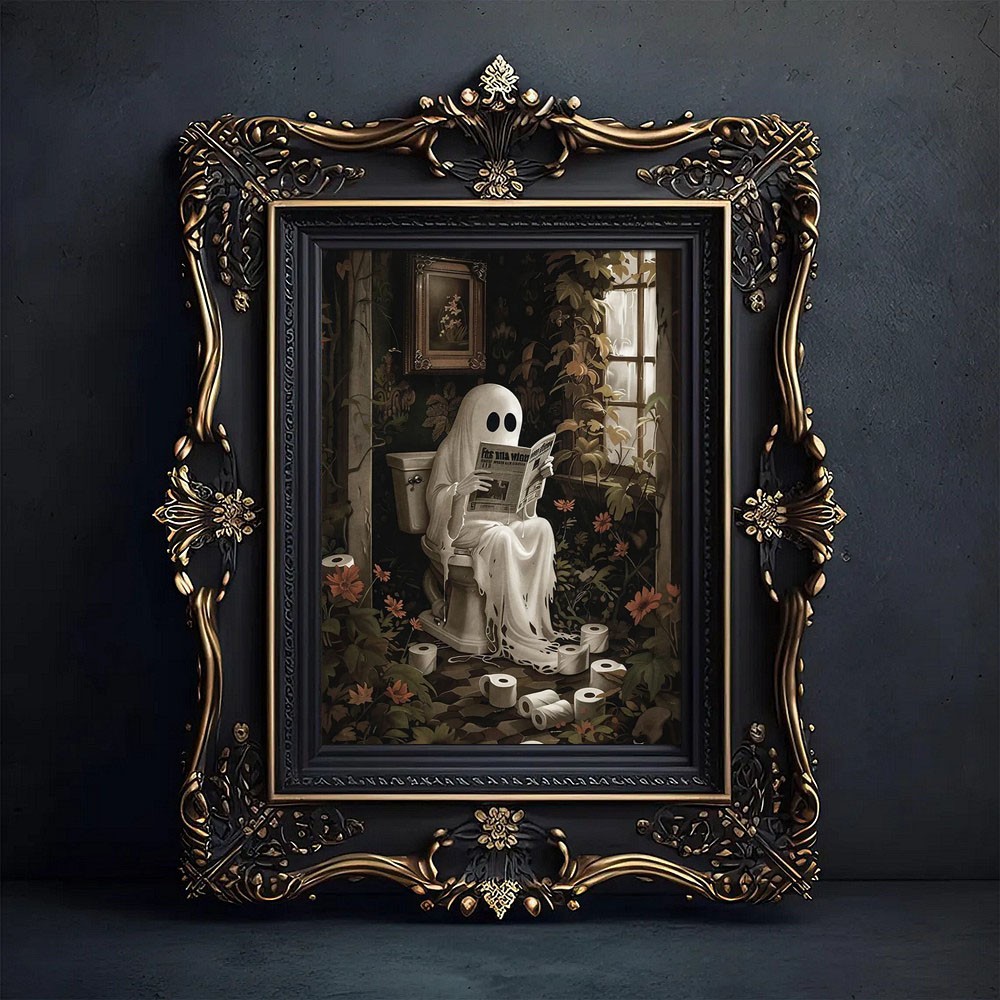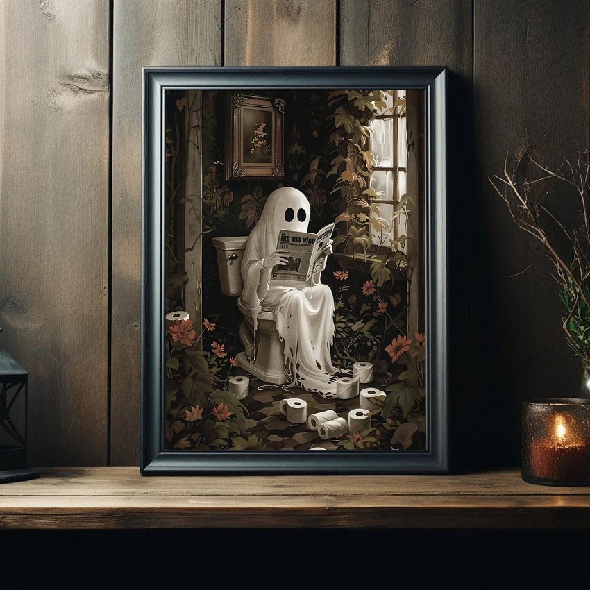 Halloween Ghost Reading Newspaper on Toilet Art Frame Halloween Decor