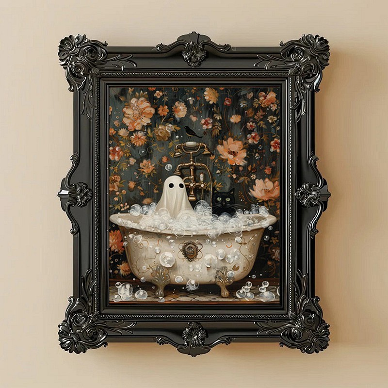 Halloween Ghosts and Black Cat in Bathtub Art Frame Halloween Decor