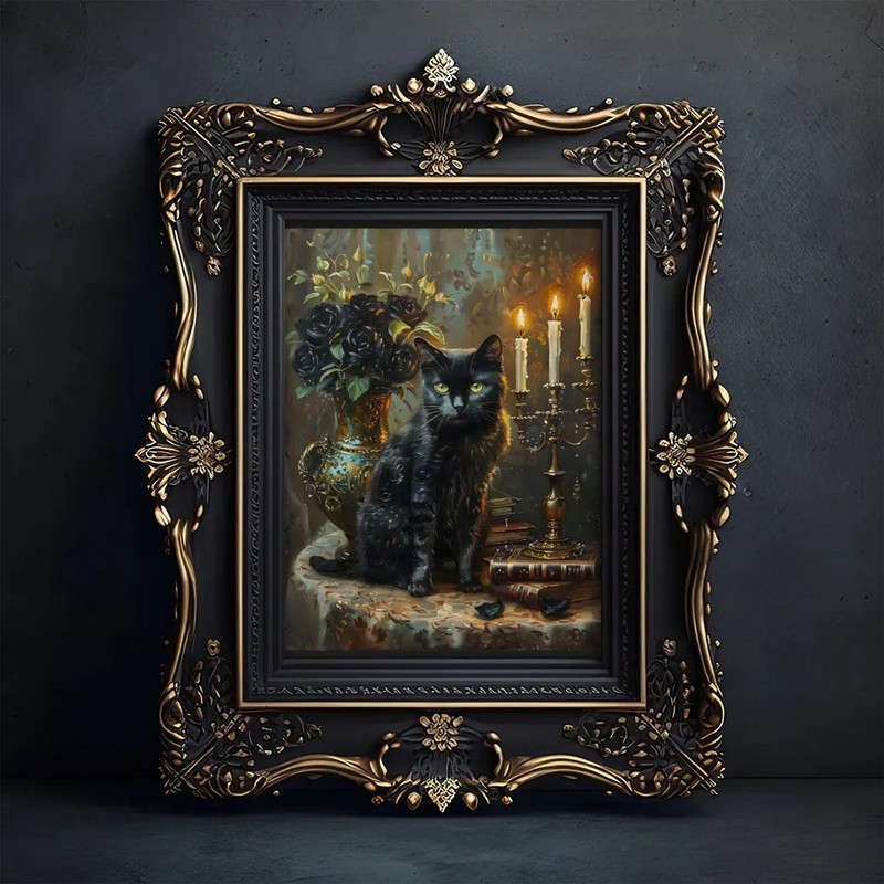 Halloween Gothic Black Roses and Black Cat Vintage Style Art Frame Halloween Decor