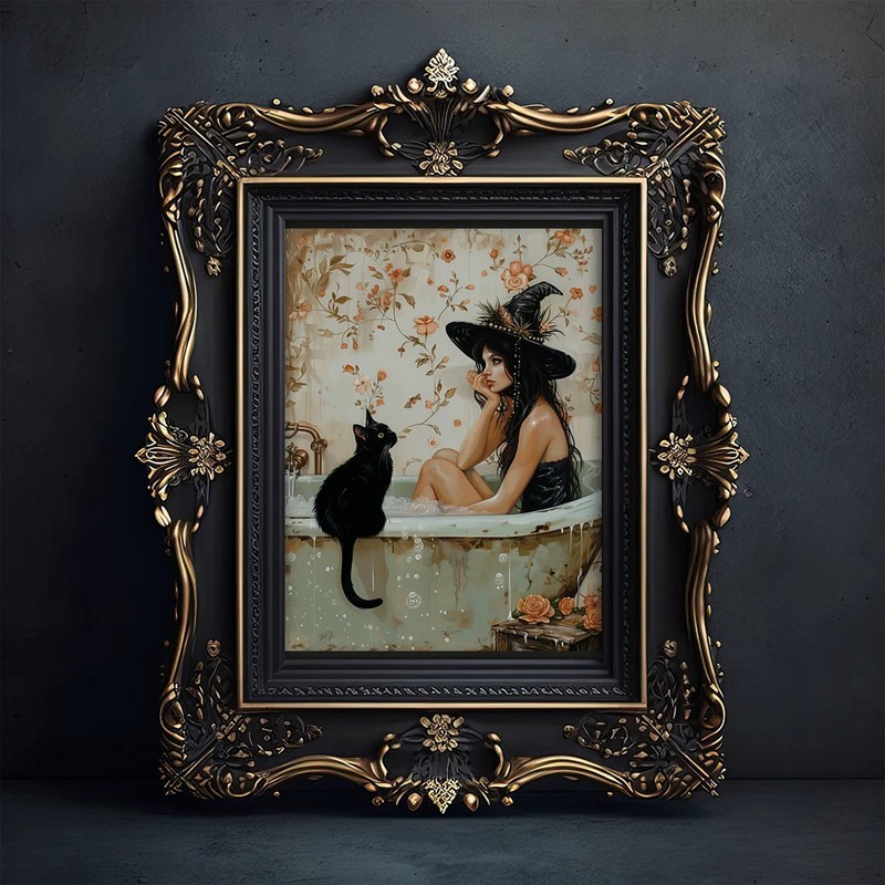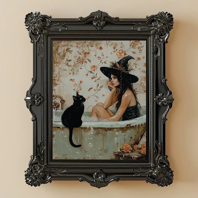 Halloween Pondering Witch in Bathtub Vintage Style Art Frame Halloween Decor