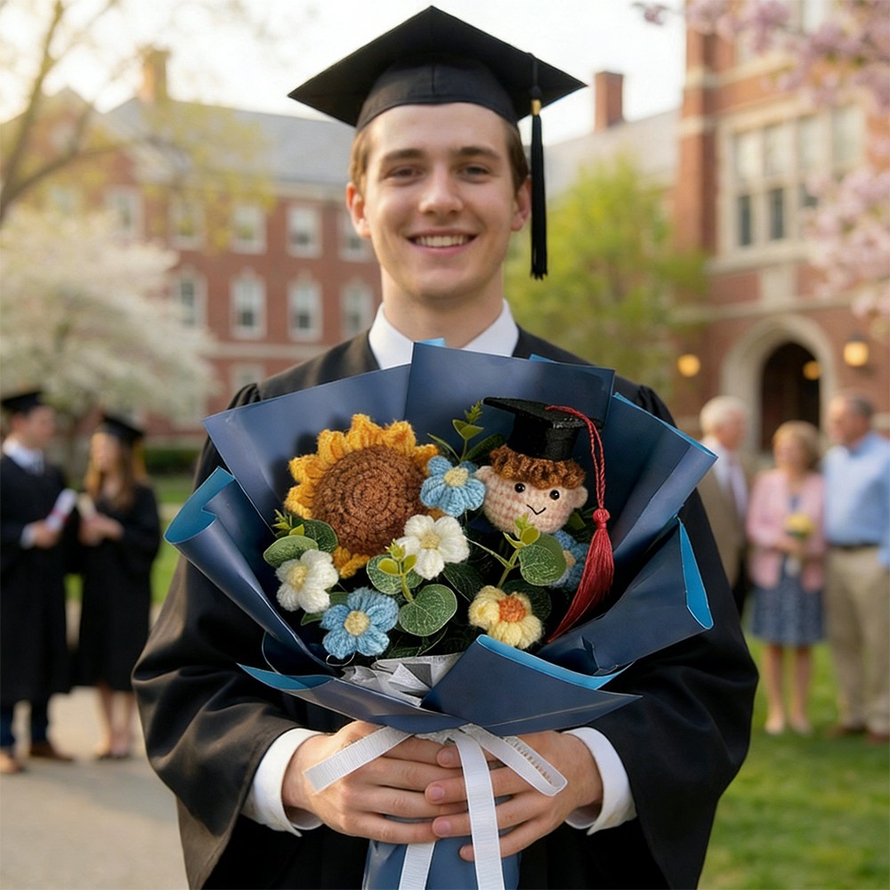 Handmade Crochet Graduation Bouquet with Knitted Graduate Plush Sunflower Keepsake Gift for Kids Graduates
