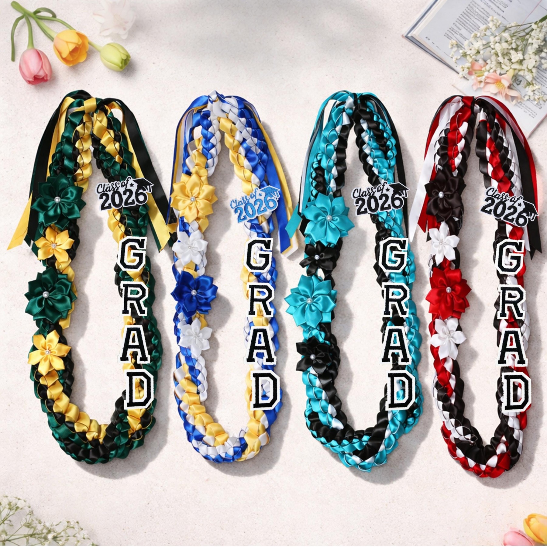 Celebrate the achievement of a lifetime with our beautifully handcrafted Graduation Lei, designed to be as unique as your graduate’s journey. This stunning lei is fully customizable, featuring vibrant satin ribbons, delicate flowers, and the graduate’s name and graduation year. It’s not just a decoration—it’s a symbol of success, pride, and new beginnings.