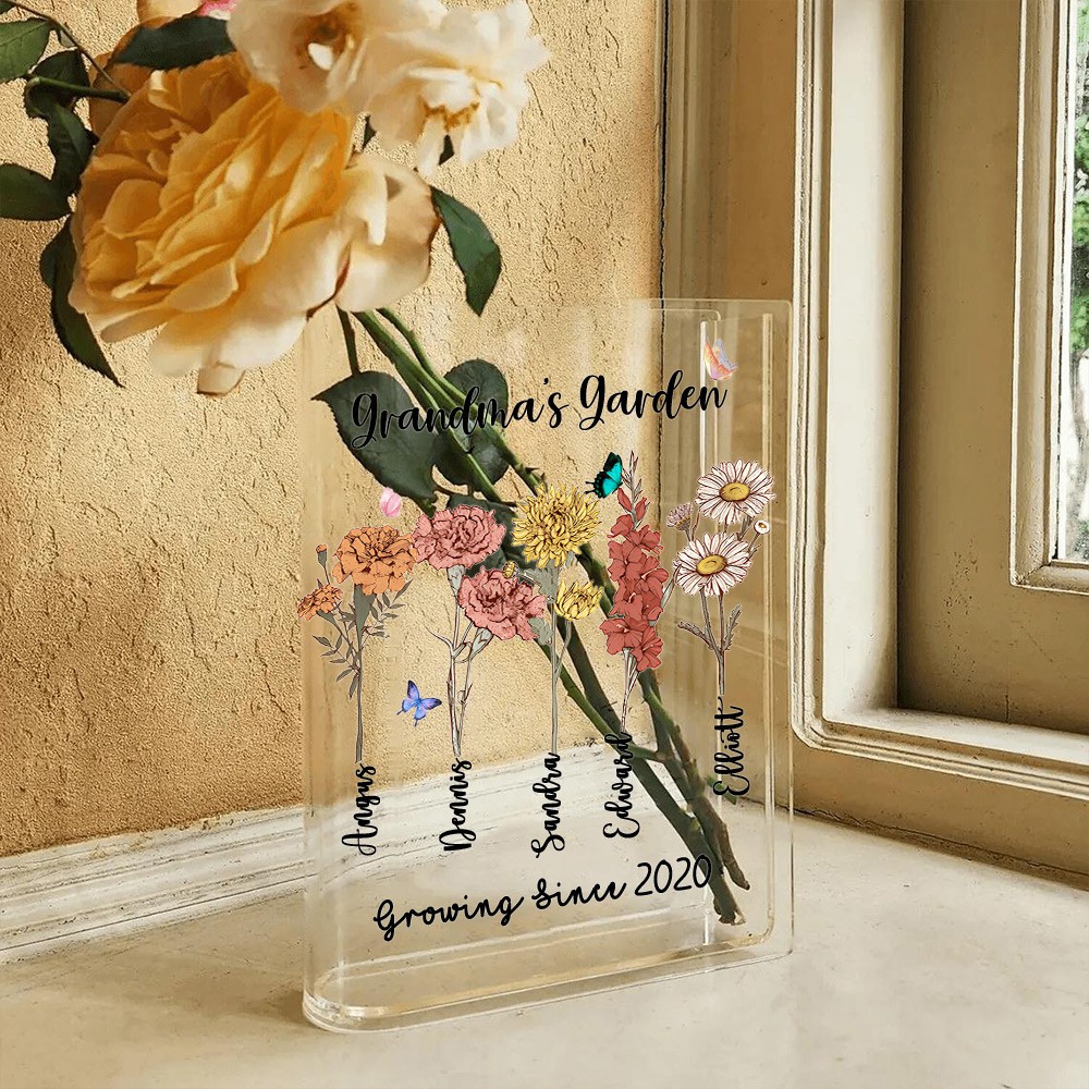 Personalized Grandma's Garden Birth Month Flower Book Vase With Grandkids Name Keepsake Gifts For Mom Grandma