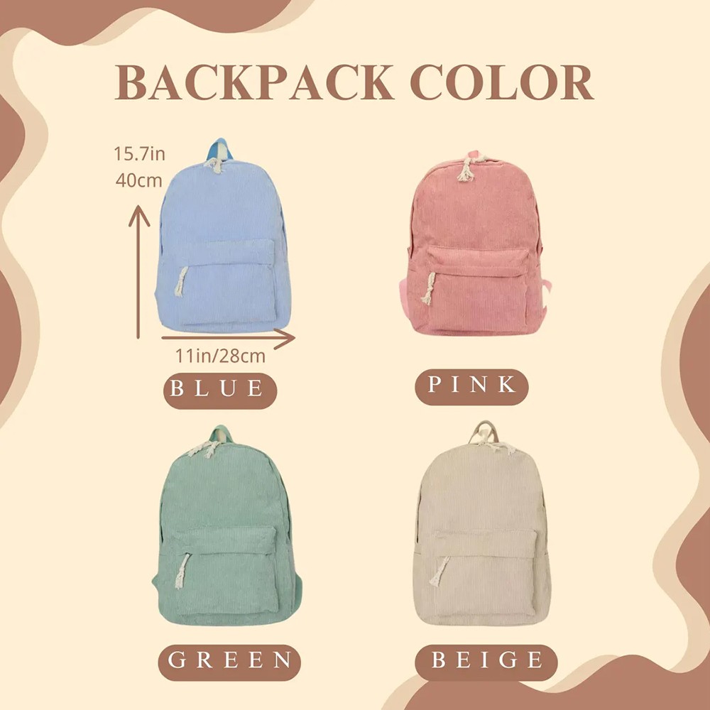 -- With dimensions of 15" x 11" x 5", our sturdy corduroy backpacks are spacious and comfy for all-day wear.
