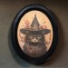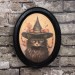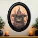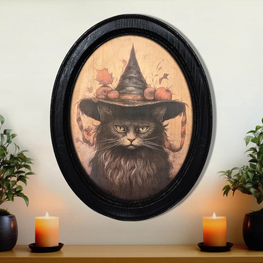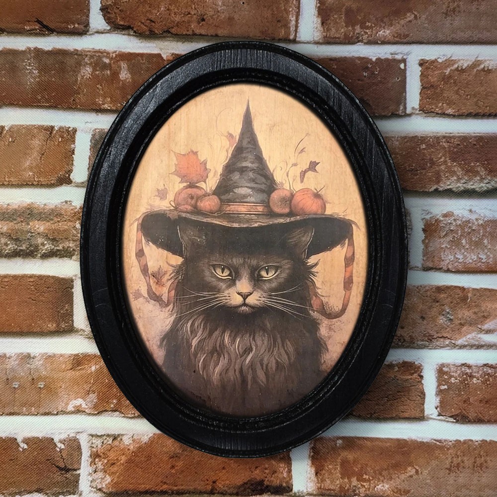 Vintage Black Cat in Witch Hat Halloween Black Oval Wooden Frame Halloween Decor