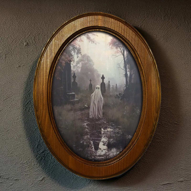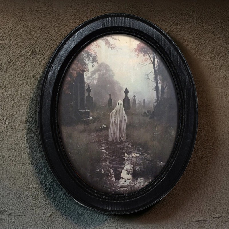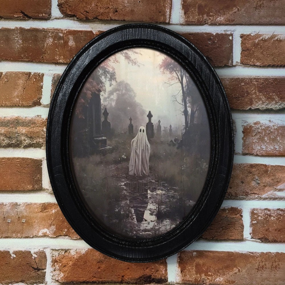 Vintage Ghost In Cemetery Halloween Black Oval Gothic Style Wooden Frame Halloween Decor
