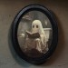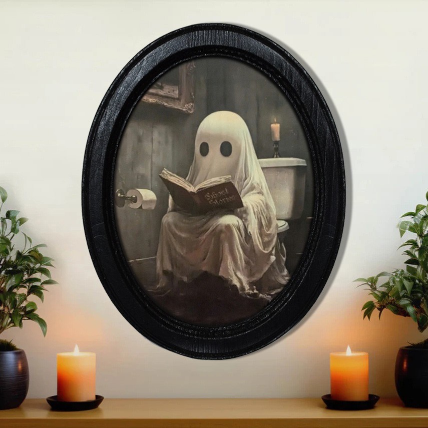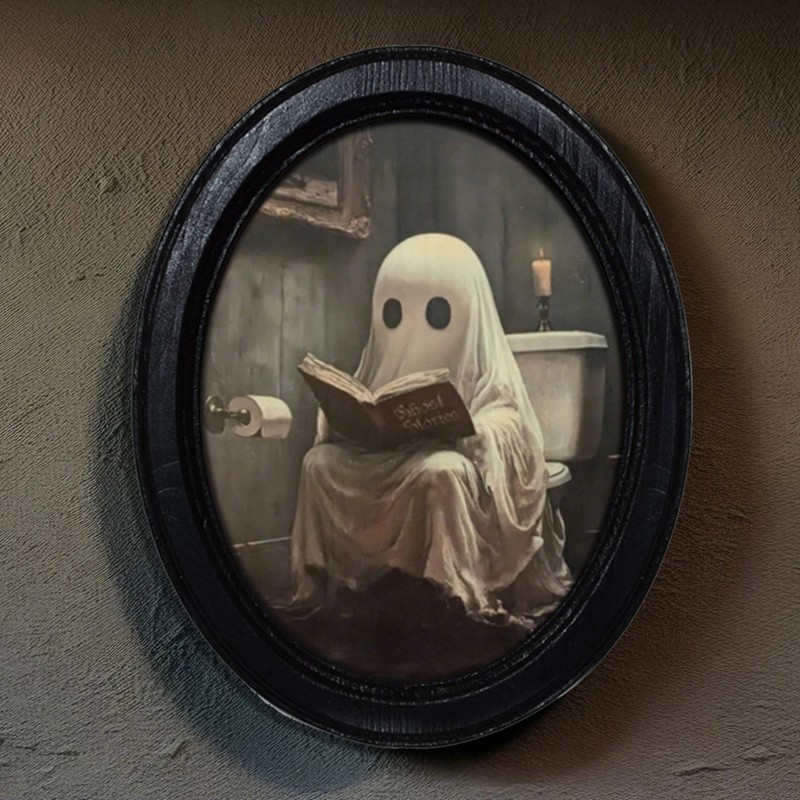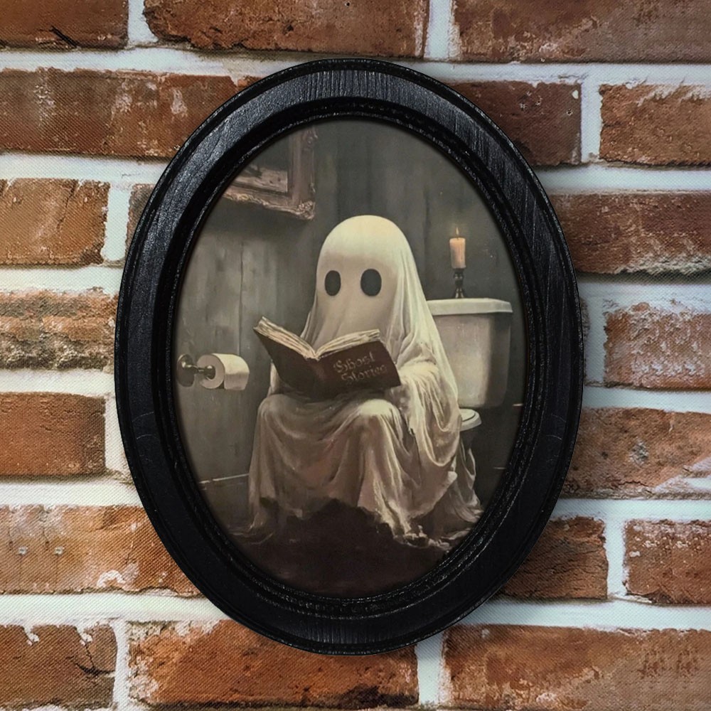 Vintage Ghost on Toilet Halloween Black Oval Wooden Frame Halloween Decor